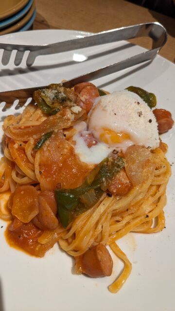 途中で温泉卵を崩してパスタに混ぜ混ぜ。絡めて味変!