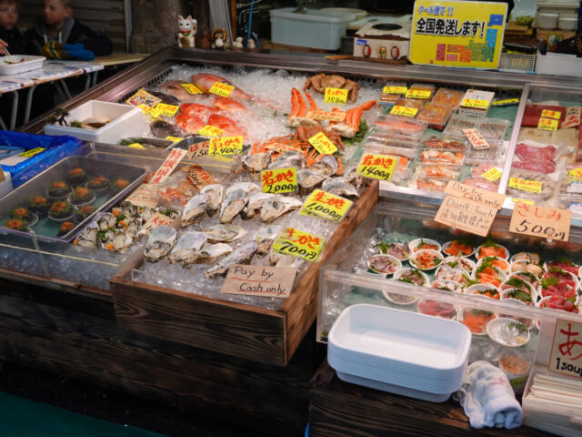 観光客がたくさん歩いている築地は魚のホールよりも立ち食い中心にシフト。プロの方は豊洲へ~お刺身とか生ガキもスタンディングスタイルOK。ウニも!