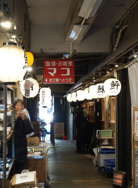朝食後、お寿司屋さんの角を曲がり露地ぽいところに入った途端、裸電球の下にずらりと並ぶ